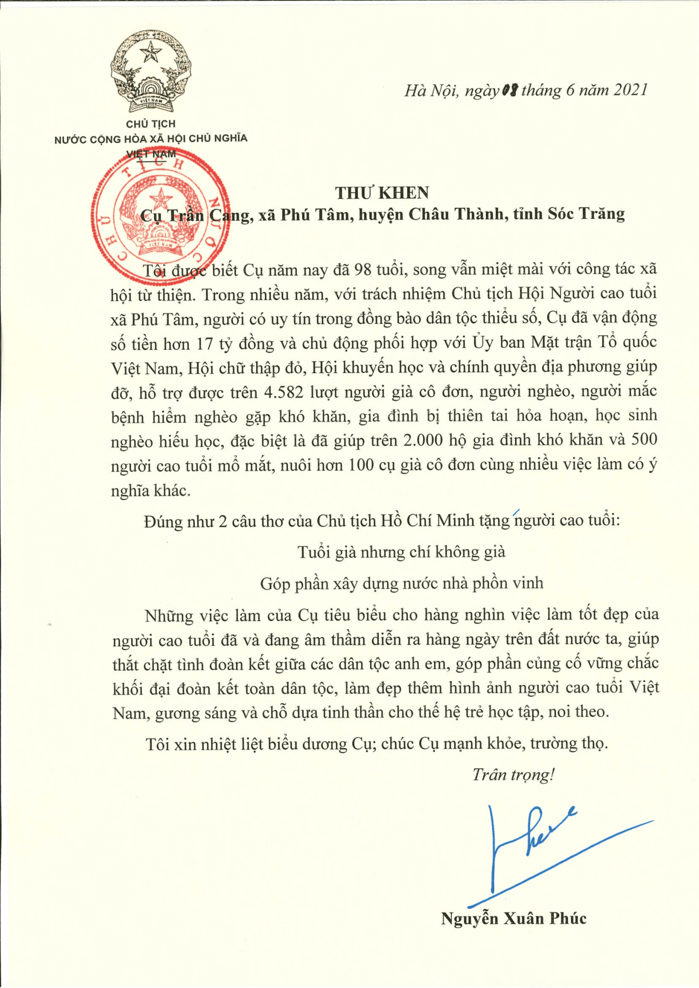 Nhân kỷ niệm ngày truyền thống Thi đua yêu nước 11/6, Chủ tịch nước Nguyễn Xuân phúc đã gửi Thư khen cụ Trần Cang, người có uy tín trong đồng bào thiểu số, thường trú tại xã Phú Tâm, huyện Châu Thành, tỉnh Sóc Trăng. Cụ Cang nhiều năm liền không quản công sức, khó khăn, tự nguyện làm từ thiện xã hội, giúp đỡ, hỗ trợ cho hàng nghìn người có hoàn cảnh khó khăn. VPCTN xin giới thiệu nội dung bức thư: