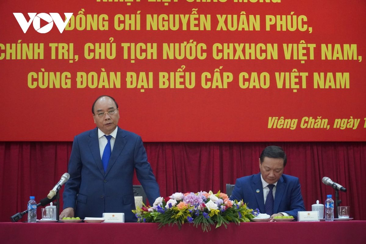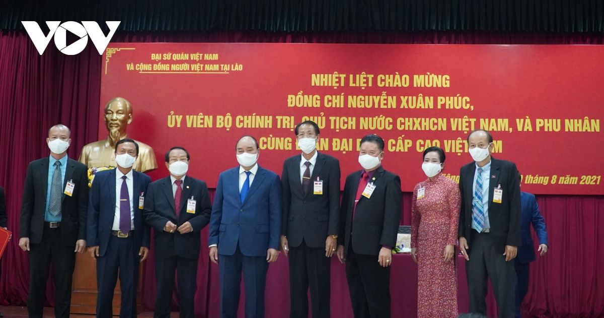 Chủ tịch nước nhấn mạnh, 100.000 người Việt Nam ở Lào đều luôn hướng về Tổ quốc, và nhiệt thành hỗ trợ đồng bào ở trong nước khi gặp khó khăn hoạn nạn do thiên tai và dịch Covid-19. Trên tinh thần đó, Chủ tịch nước Nguyễn Xuân Phúc mong cộng đồng người ở đây tiếp tục phát huy truyền thống, để mỗi người con đất Việt sống và làm việc ở Lào là một tấm gương sáng, xứng danh người Việt Nam.