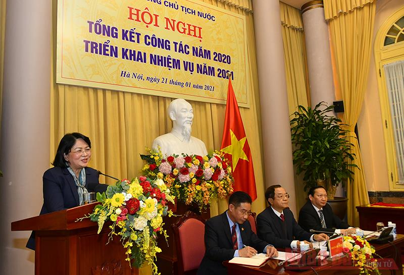 Báo cáo tại Hội nghị, phát biểu của đồng chí Đặng Thị Ngọc Thịnh và một số đại biểu nêu rõ, năm 2020, Văn phòng Chủ tịch nước đã tập trung nghiên cứu, tham mưu, phục vụ có hiệu quả các hoạt động đối nội, đối ngoại của Tổng Bí thư, Chủ tịch nước; Phó Chủ tịch nước. Đặc biệt là phục vụ Chủ tịch nước, Phó Chủ tịch nước dự các hội nghị Trung ương khóa XII; Tổng Bí thư, Chủ tịch nước họp Bộ Chính trị, lãnh đạo chủ chốt của Đảng, Nhà nước; dự các kỳ họp thứ chín, thứ 10 Quốc hội khóa XIV; dự và chỉ đạo Đại hội Thi đua yêu nước toàn quốc lần thứ X; tham mưu Tổng Bí thư, Chủ tịch nước một số nội dung quan trọng về triển khai Chương trình đối nội, đối ngoại năm 2021. Năm 2020, tập thể cán bộ, công chức, người lao động Văn phòng Chủ tịch nước đã nêu cao tinh thần trách nhiệm, ý thức tổ chức kỷ luật, đoàn kết thống nhất, phát huy trí tuệ tập thể, làm tốt nhiệm vụ tham mưu, phục vụ trong các lĩnh vực lập pháp, hành pháp, tư pháp, quốc phòng, an ninh và đối ngoại,…