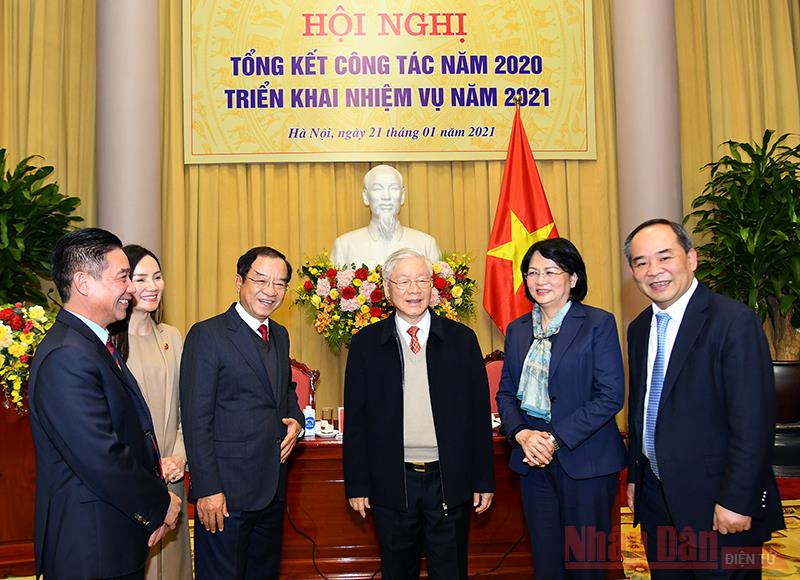 Phát biểu ý kiến tại Hội nghị, Tổng Bí thư, Chủ tịch nước Nguyễn Phú Trọng hoan nghênh Văn phòng Chủ tịch nước đã có sáng kiến kết hợp tổng kết cả công tác chuyên môn, công tác xây dựng Đảng và công tác đoàn thể. Đây là cách làm hay có thể phát huy. Đánh giá cao kết quả công tác của Văn phòng Chủ tịch nước năm 2020, Tổng Bí thư, Chủ tịch nước mong muốn cán bộ, công chức cơ quan cần nhận thức đầy đủ, sâu sắc hơn nữa về ý nghĩa, vị trí, vai trò, tầm quan trọng của Văn phòng Chủ tịch nước trong thời kỳ mới. Công tác văn phòng không chỉ phục vụ, giúp việc đơn thuần mà phải là cơ quan tham mưu chiến lược về chủ trương, biện pháp, đề xuất chủ trương mới, phát hiện cái mới, kiến nghị những công việc theo đúng chức năng, nhiệm vụ của Chủ tịch nước theo quy định của pháp luật ở tầm cao hơn. Muốn tham mưu, đề xuất đúng, cán bộ, công chức phải có trình độ chuyên môn cao, có trí tuệ, có bản lĩnh chính trị vững vàng, có phương pháp tư duy, làm việc khoa học. Lâu nay, Văn phòng đã làm tốt, cần làm tốt hơn nữa, nâng tầm tham mưu lên nữa. Văn phòng Chủ tịch nước là cơ quan tham mưu cả về đối nội, đối ngoại, đó là những công việc hệ trọng, tuyệt đối không được để xảy ra sơ suất. Bản thân mỗi cán bộ, công chức cần không ngừng phấn đấu công tác và học tập tốt hơn nữa. Đồng thời, cơ quan, Đảng bộ Văn phòng phải chăm lo làm tốt công tác xây dựng Đảng, đặc biệt là xây dựng về con người; có kế hoạch đào tạo, bồi dưỡng, có chế độ chính sách phù hợp để mỗi cán bộ, đảng viên, công chức vừa có trình độ cao, vừa có bản lĩnh vững vàng, có nguyên tắc, làm việc khoa học, hiệu quả. Công tác chuyên môn phải gắn liền với công tác xây dựng Đảng và công tác đoàn thể.