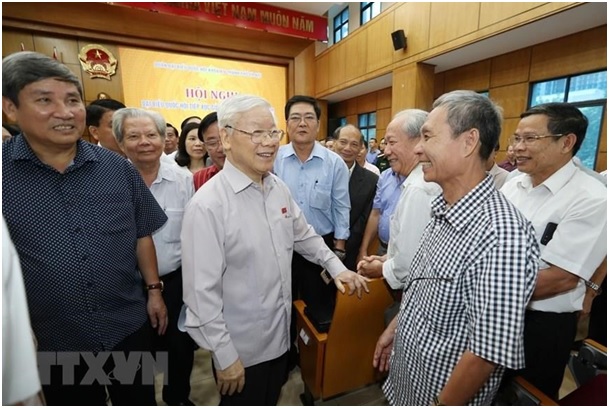 Tổng Bí thư, Chủ tịch nước Nguyễn Phú Trọng với cử tri quận Ba Đình, Hoàn Kiếm và Tây Hồ. (Ảnh: Trí Dũng/TTXVN)