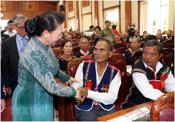 Thay mặt lãnh đạo Đảng, Nhà nước, Chủ tịch Quốc hội Nguyễn Thị Kim Ngân ghi nhận và đánh giá cao những đóng góp to lớn của đồng bào các dân tộc Tây Nguyên, trong đó có vai trò đặc biệt quan trọng của các Già làng trong việc phát triển kinh tế-xã hội các tỉnh Tây Nguyên nói riêng và cả nước nói chung.
