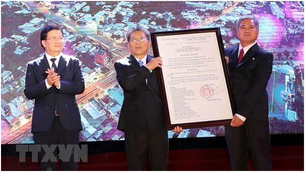 Phó Thủ tướng Trịnh Đình Dũng trao Quyết định của Thủ tướng Chính phủ công nhận thành phố Bến Tre là đô thị loại II trực thuộc tỉnh Bến Tre. (Ảnh: Trọng Đức/TTXVN)