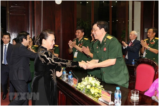 Chủ tịch Quốc hội Nguyễn Thị Kim Ngân gặp gỡ các đị biểu dự chương trình Tri ân đồng đội. (Ảnh: Dương Giang/TTXVN)