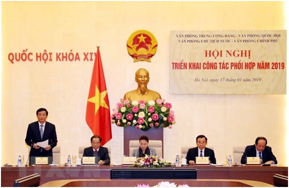 Chiều 17/1, tại Nhà Quốc hội, Chủ tịch Quốc hội Nguyễn Thị Kim Ngân đã dự Hội nghị triển khai công tác phối hợp năm 2019 giữa Văn phòng Trung ương Đảng, Văn phòng Quốc hội, Văn phòng Chủ tịch nước và Văn phòng Chính phủ.