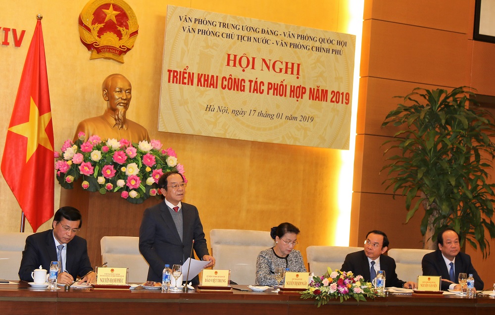 Chủ tịch Quốc hội nhấn mạnh năm 2019 là năm có nhiều sự kiện quan trọng của đất nước, như: tổng kết 5 năm triển khai thi hành Hiến pháp; tổng kết thí điểm hợp nhất ba Văn phòng cấp tỉnh; triển khai các nội dung chuẩn bị Đại hội Đảng bộ các cấp tiến tới Đại hội Đảng toàn quốc lần thứ XIII, trong đó có triển khai Nghị quyết Hội nghị Trung ương 9 về quy hoạch Ban Chấp hành Trung ương Đảng nhiệm kỳ 2021-2026; đồng thời là năm bứt phá để hoàn thành kế hoạch 5 năm (2016-2020) theo Nghị quyết Đại hội đề ra…