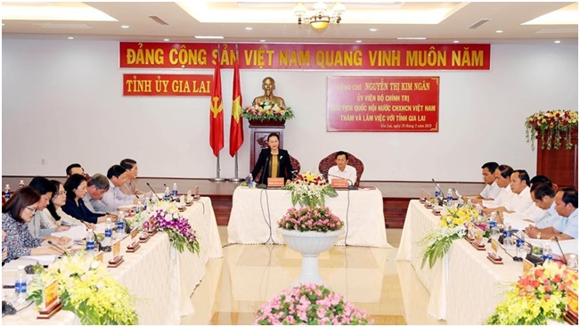 Phát biểu tại buổi làm việc, Chủ tịch Quốc hội Nguyễn Thị Kim Ngân biểu dương và chúc mừng những kết quả kinh tế-xã hội, công tác xây dựng Đảng năm 2018 của tỉnh Gia Lai.