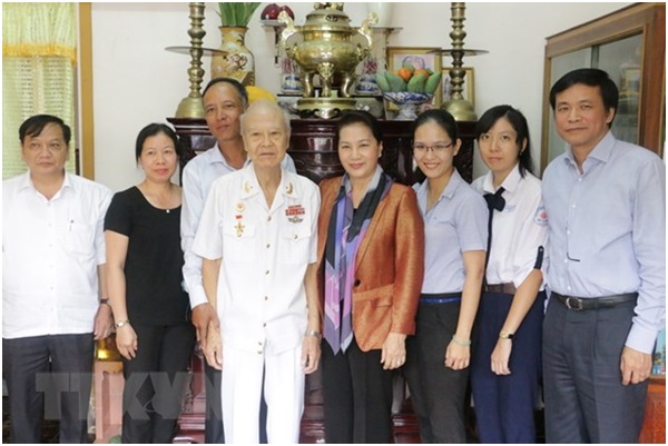 Chủ tịch Quốc hội Nguyễn Thị Kim Ngân thăm gia đình Anh hùng Lực lượng vũ trang nhân dân Nguyễn Hữu Phước. (Ảnh: Hồng Giang/TTXVN)