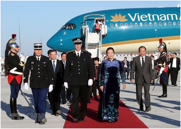 Đúng 17 giờ 25 phút ngày 30/3 (giờ địa phương), Chủ tịch Quốc hội Nguyễn Thị Kim Ngân và Đoàn đại biểu cấp cao Quốc hội Việt Nam đã đến Sân bay Orly, thủ đô Paris, bắt đầu thăm chính thức Cộng hòa Pháp theo lời mời của Chủ tịch Hạ viện Pháp Richard Ferrand.