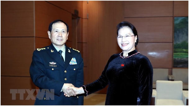 Chủ tịch Quốc hội Nguyễn Thị Kim Ngân tiếp Bộ trưởng Bộ Quốc phòng Trung Quốc Ngụy Phượng Hòa. (Ảnh: Trọng Đức/TTXVN)