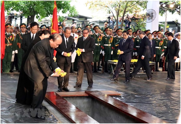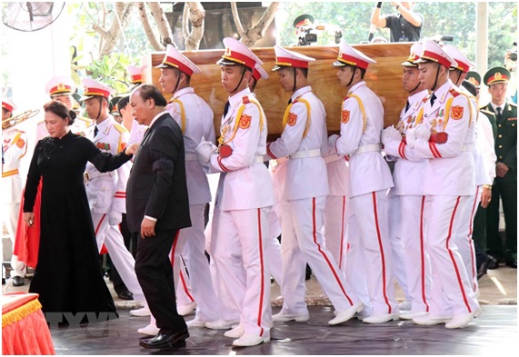Thủ tướng Nguyễn Xuân Phúc và Chủ tịch Quốc hội Nguyễn Thị Kim Ngân đón linh cữu nguyên Chủ tịch nước, Đại tướng Lê Đức Anh. (Ảnh: Mạnh Linh/TTXVN)