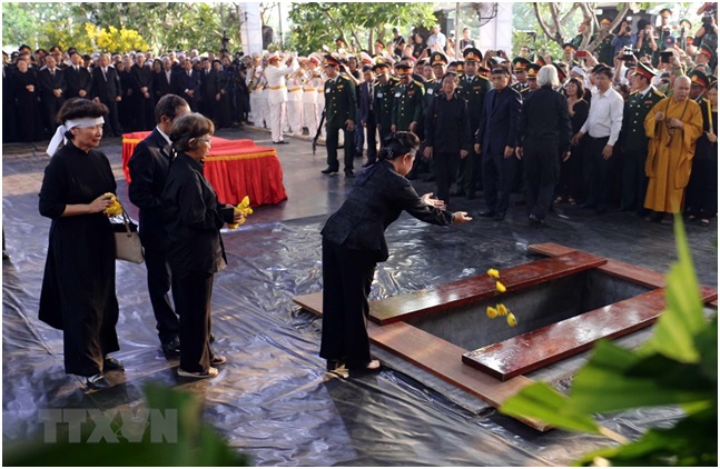 Gia quyến của nguyên Chủ tịch nước, Đại tướng Lê Đức Anh thực hiện nghi thức an táng. (Ảnh: Mạnh Linh/TTXVN)