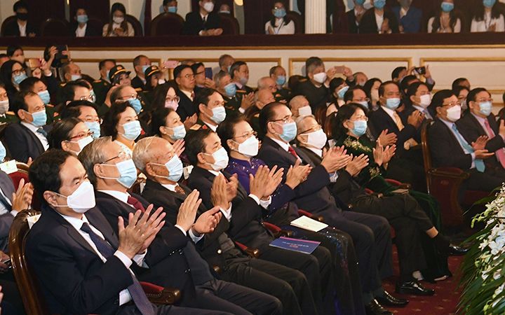 Chủ tịch QH Nguyễn Thị Kim Ngân cùng các đồng chí lãnh đạo, nguyên lãnh đạo Đảng, Nhà nước dự lễ kỷ niệm. Ảnh: TRỌNG ĐỨC (TTXVN)