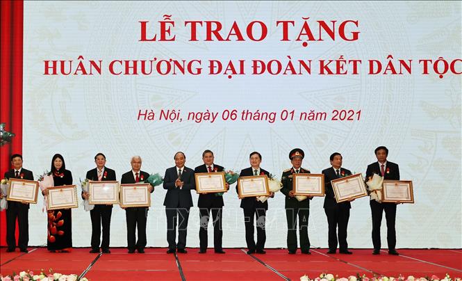 Thủ tướng Nguyễn Xuân Phúc trao Huân chương Đại đoàn kết dân tộc cho các Ủy viên Ủy ban Thường vụ Quốc hội. Ảnh: Trọng Đức/TTXVN