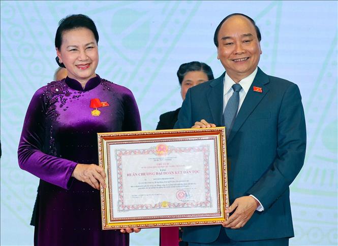 Thủ tướng Nguyễn Xuân Phúc trao Huân chương Đại đoàn kết dân tộc cho Chủ tịch Quốc hội Nguyễn Thị Kim Ngân và các Phó Chủ tịch Quốc hội. Ảnh: Trọng Đức/TTXVN