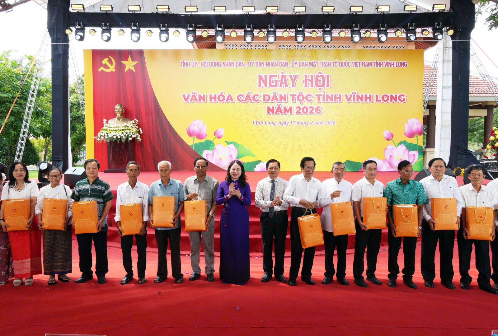 Phó Chủ tịch nước Võ Thị Ánh Xuân và Bí thư Tỉnh ủy Vĩnh Long Trần Văn Lâu tặng quà cho người có uy tín trong đồng bào dân tộc của tỉnh. Ảnh: VPCTN