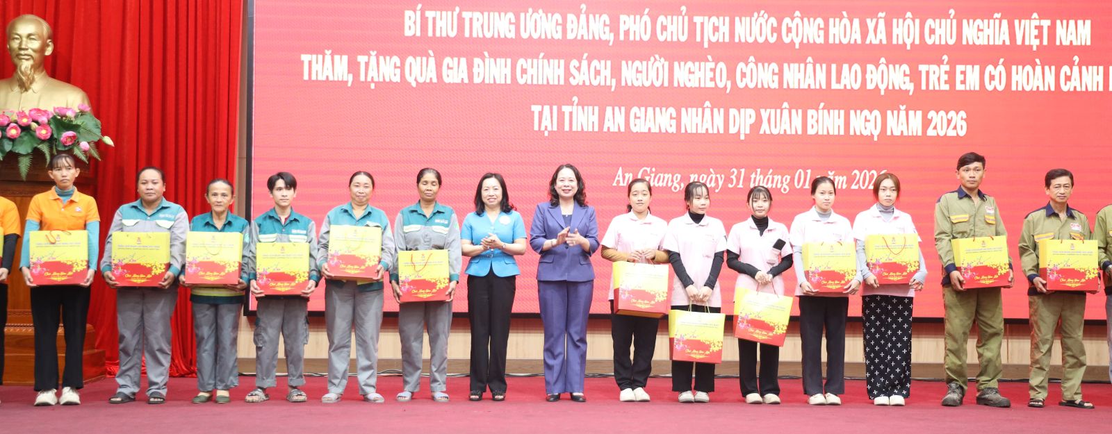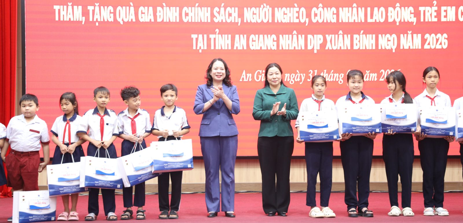 Tại Hội trường Tỉnh ủy An Giang, Phó Chủ tịch nước Võ Thị Ánh Xuân cùng Đoàn công tác đã trao tặng 600 phần quà cho các gia đình chính sách (trong đó có Mẹ Việt Nam Anh hùng Trần Thị Thi), người nghèo và công nhân lao động có hoàn cảnh khó khăn; tặng 200 triệu đồng hỗ trợ trẻ em nghèo vượt khó trên địa bàn tỉnh.