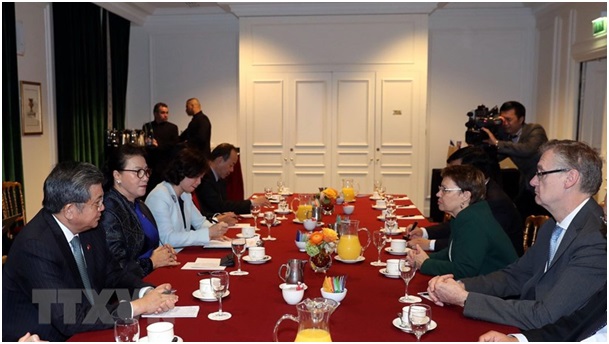 Chia sẻ kết quả làm việc với đại diện 15 doanh nghiệp Pháp vào sáng cùng ngày, Chủ tịch Quốc hội Nguyễn Thị Kim Ngân cho biết nhiều doanh nghiệp Pháp mong muốn đầu tư tại Việt Nam và hiện tại có 200 doanh nghiệp Pháp đầu tư tại Việt Nam. Tuy nhiên, Chủ tịch Quốc hội cho rằng, kim ngạch xuất nhập khẩu hai chiều năm 2018 mới đạt mức khoảng 5 tỷ USD là còn chưa tương xứng với tiềm năng hợp tác của hai nước.