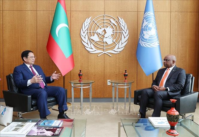 Thủ tướng Phạm Minh Chính ông Abdulla Shahid, Chủ tịch Đại hội đồng Liên hợp quốc. Ảnh: Dương Giang/TTXVN