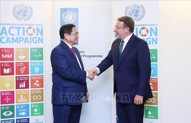 Thủ tướng Phạm Minh Chính gặp Tổng giám đốc Chương trình Phát triển Liên hợp quốc (UNDP) Achim Steiner. Ảnh: Dương Giang/TTXVN