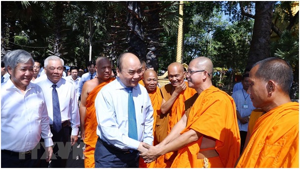 Thủ tướng Nguyễn Xuân Phúc đến thăm, chúc Tết và tặng quà tại Trường Bổ túc văn hoá Pali Trung cấp Nam Bộ và các vị Hoà thượng, Thượng toạ, Đại đức và sư sãi trong Hội Đoàn kết sư sãi yêu nước tỉnh Sóc Trăng. (Ảnh: Thống Nhất/TTXVN)