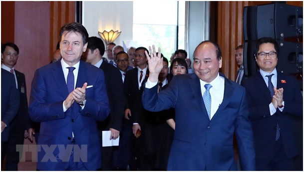 Thủ tướng Nguyễn Xuân Phúc và Thủ tướng Cộng hòa Italy Giuseppe Conte tới dự Diễn đàn Doanh nghiệp ASEAN-Italy. (Ảnh: Thống Nhất /TTXVN)
