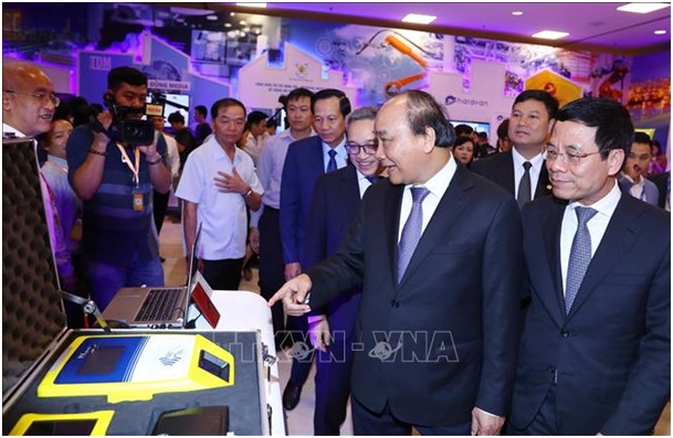 Thủ tướng Nguyễn Xuân Phúc tham quan các sản phẩm công nghệ của các doanh nghiệp Việt Nam. Ảnh: Thống Nhất/TTXVN