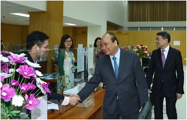 Thủ tướng Nguyễn Xuân Phúc đến thăm, chúc Tết cán bộ, viên chức, người lao động Ngân hàng Chính sách xã hội trong ngày làm việc đầu tiên của Xuân Kỷ Hợi 2019. (Ảnh: Thống Nhất/TTXVN)