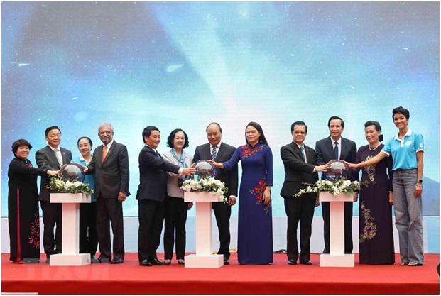 Thủ tướng Nguyễn Xuân Phúc, và các đại biểu nhấn nút phát động Năm an toàn cho phụ nữ và trẻ em. (Ảnh: Phương Hoa/TTXVN)