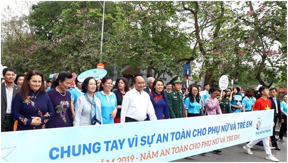 Thủ tướng Nguyễn Xuân Phúc và các đại biểu cùng tham gia đi bộ trên đường Đinh Tiên Hoàng, hưởng ứng Năm an toàn cho phụ nữ và trẻ em. (Ảnh: Thống Nhất/TTXVN)
