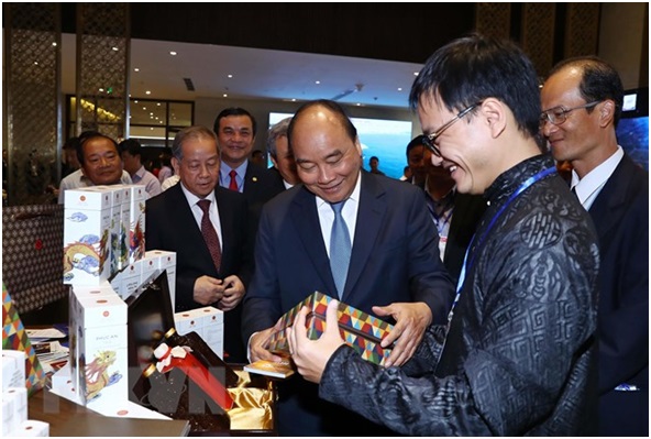 Thủ tướng Nguyễn Xuân Phúc và các đại biểu thăm các gian hàng trưng bày tại hội nghị. (Ảnh: Thống Nhất/TTXVN)