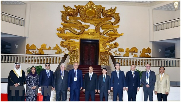 Thủ tướng Nguyễn Xuân Phúc và các Trưởng đoàn tại buổi tiếp. (Ảnh: Thống Nhất/TTXVN)