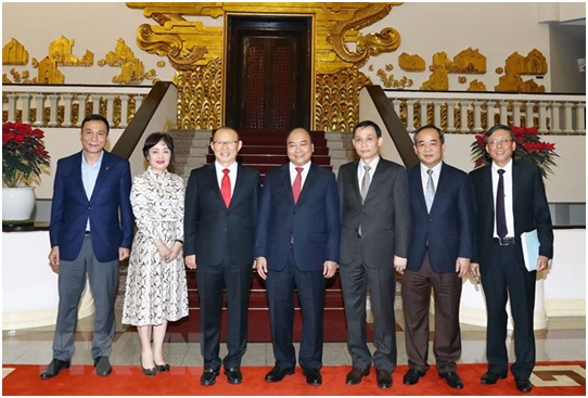Thủ tướng Nguyễn Xuân Phúc với huấn luyện viên Park Hang-seo và các đại biểu tại buổi tiếp. (Ảnh: Thống Nhất/TTXVN)