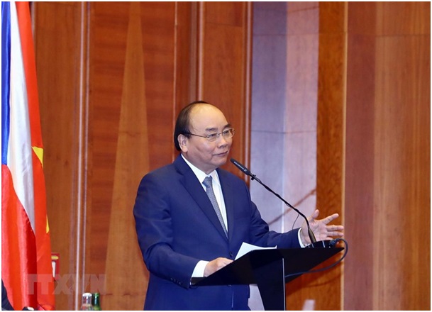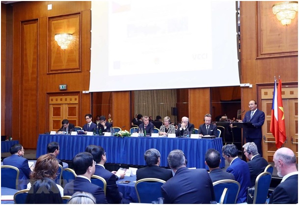 Thông tin về tình hình kinh tế-xã hội của Việt Nam đến các doanh nghiệp, nhà đầu tư Cộng hòa Séc, Thủ tướng Nguyễn Xuân Phúc nêu rõ Việt Nam có môi trường chính trị xã hội ổn định; nền nông nghiệp nhiệt đới, công nghiệp chế biến chế tạo phát triển nhanh, xuất khẩu nhiều khu vực trên thế giới.