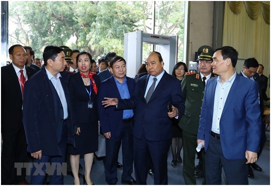Thủ tướng Nguyễn Xuân Phúc kiểm tra Trung tâm Báo chí quốc tế Hội nghị Thượng đỉnh Mỹ-Triều Tiên lần thứ hai. (Ảnh: TTXVN)