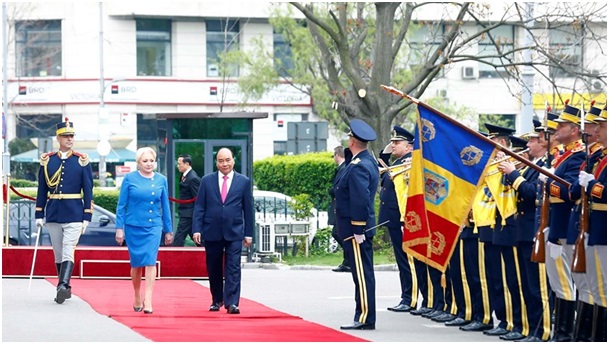 Vào lúc 9 giờ 30 sáng 15/4 theo giờ địa phương, tức chiều cùng ngày, theo giờ Việt Nam, lễ đón chính thức Thủ tướng Chính phủ Nguyễn Xuân Phúc đã diễn ra trọng thể tại Phủ Thủ tướng Romania ở thủ đô Bucharest.