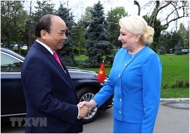 Thủ tướng Romania Viorica Dancila đón Thủ tướng Nguyễn Xuân Phúc. (Ảnh: Thống Nhất/TTXVN)