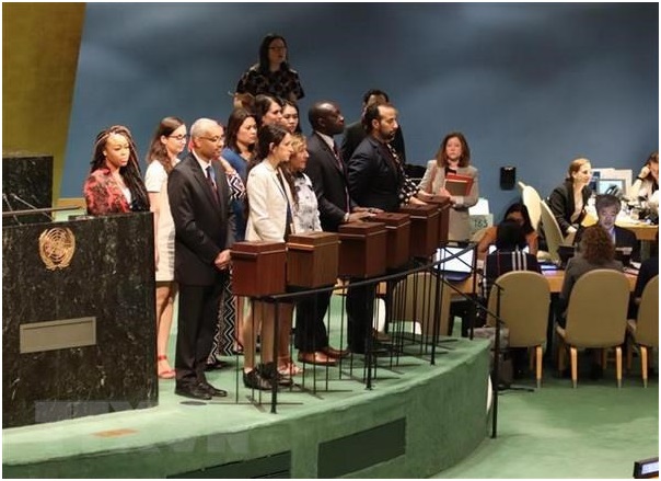 Niềm vui của các thành viên đoàn Việt Nam khi trúng cử với số phiếu gần như tuyệt đối. (Ảnh: Nhóm phóng viên TTXVN tại New York)