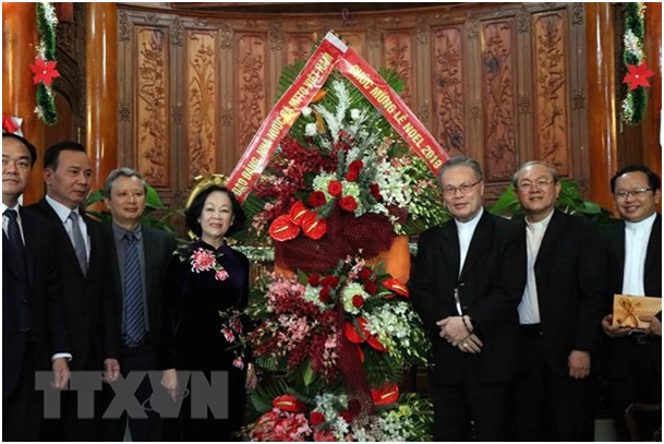 Ủy viên Bộ Chính trị, Bí thư Trung ương Đảng, Trưởng Ban Dân vận Trung ương Trương Thị Mai tặng lẵng hoa chúc mừng Lễ Giáng sinh năm 2019 tới Đức Tổng Giám mục Giuse Nguyễn Chí Linh, Tổng Giáo phận Huế, Chủ tịch Hội đồng Giám mục Việt Nam. (Ảnh: Đỗ Trưởng/TTXVN)