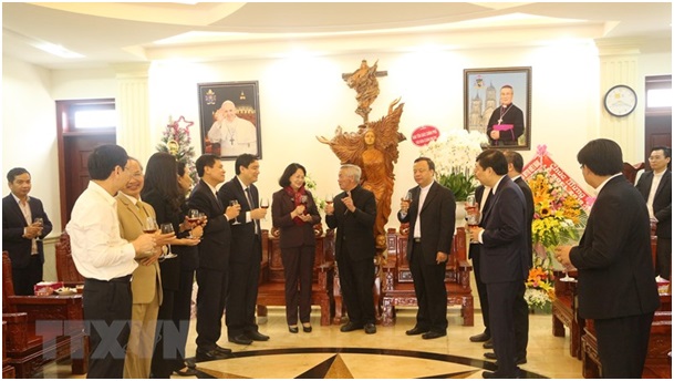 Phó Chủ tịch nước Đặng Thị Ngọc Thịnh đã thông tin đến Giám mục Giáo phận Vinh Nguyễn Hữu Long cùng các linh mục, chức sắc, chức việc một số nét về tình hình phát triển kinh tế-xã hội của đất nước trong năm 2019.