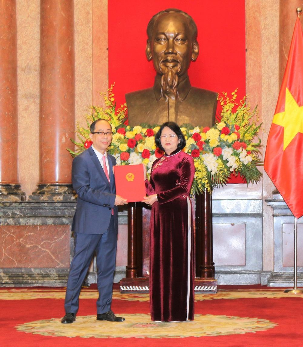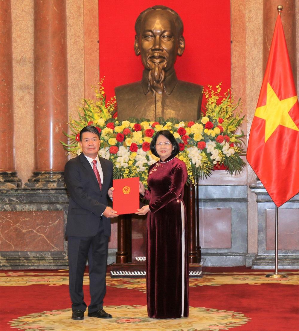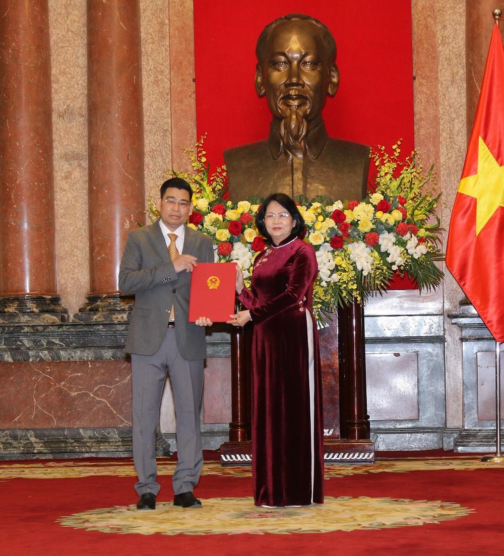 Phó Chủ tịch nước Đặng Thị Ngọc Thịnh trao Quyết định bổ nhiệm ông Phạm Việt Anh làm Đại sứ CHXHCN Việt Nam tại Vương quốc Hà Lan. (Ảnh: VPCTN/Công Gôn)