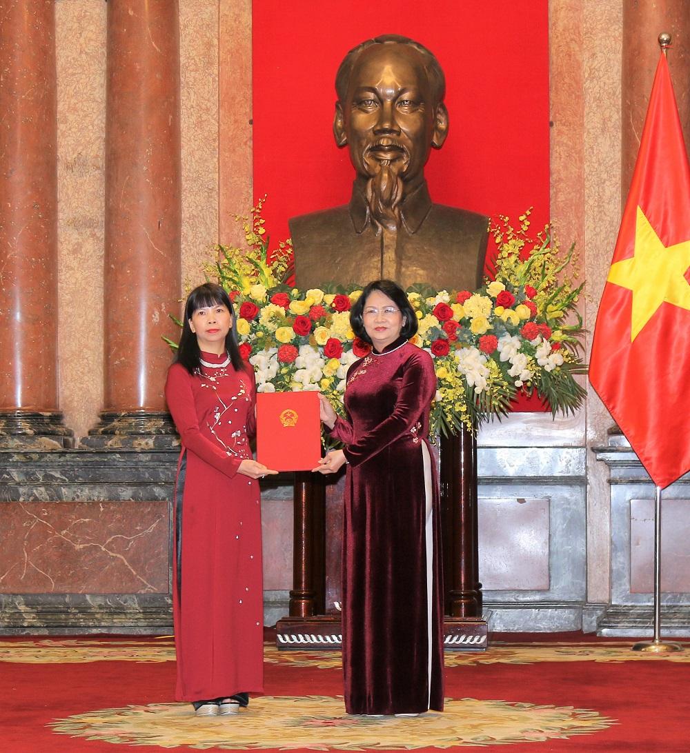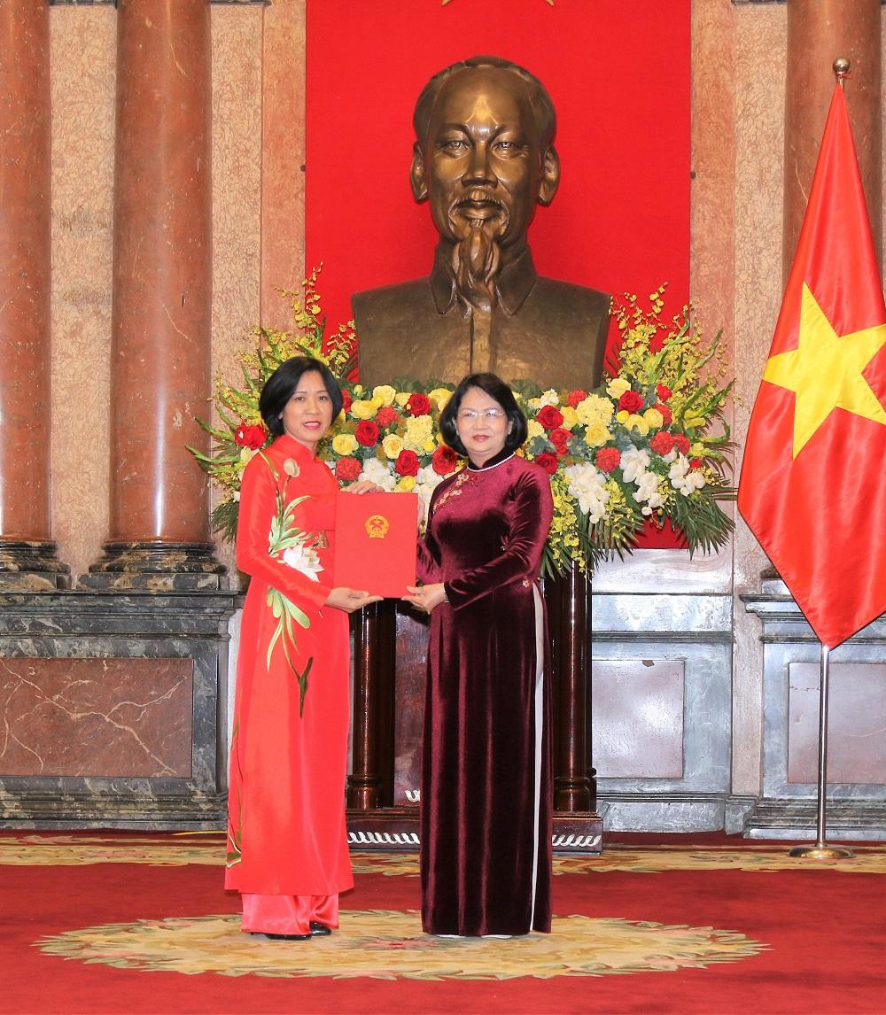 Phó Chủ tịch nước Đặng Thị Ngọc Thịnh trao Quyết định bổ nhiệm bà Đặng Thị Hải Tâm làm Đại sứ CHXHCN Việt Nam tại Cộng hòa Phần Lan kiêm nhiệm Cộng hòa Estonia. (Ảnh: VPCTN/Công Gôn)