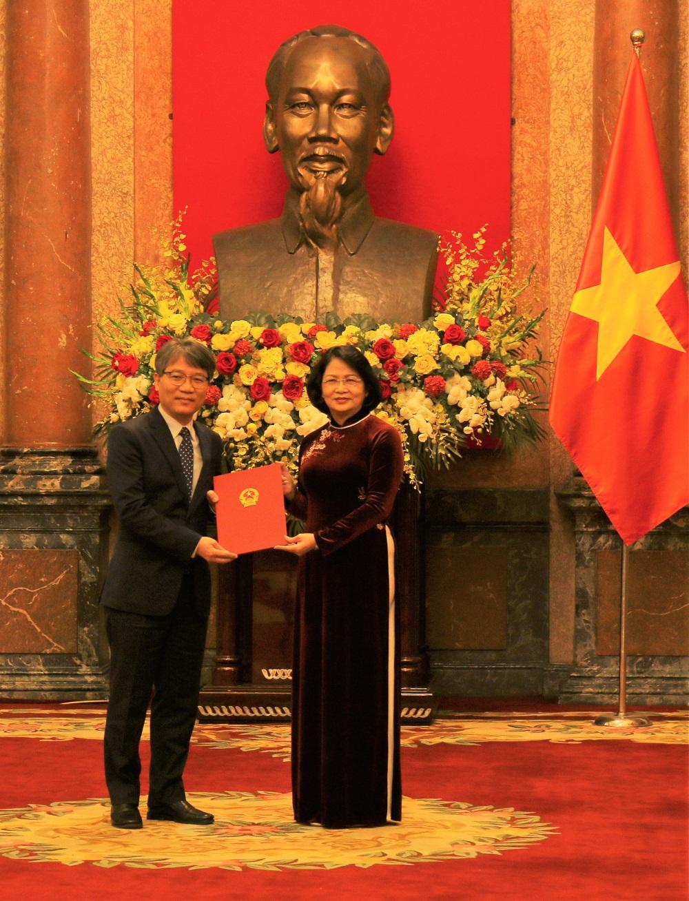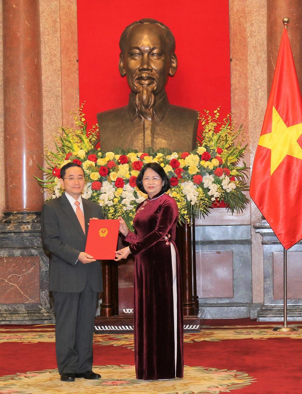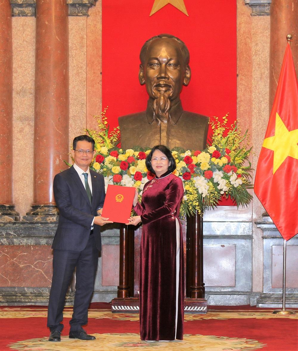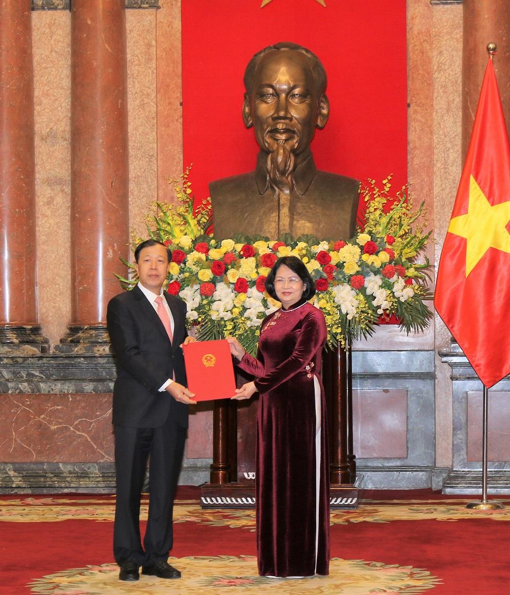 Phó Chủ tịch nước Đặng Thị Ngọc Thịnh trao Quyết định bổ nhiệm ông Nguyễn Vũ Tùng làm Đại sứ CHXHCN Việt Nam tại Đại Hàn Dân Quốc. (Ảnh: VPCTN/Công Gôn)