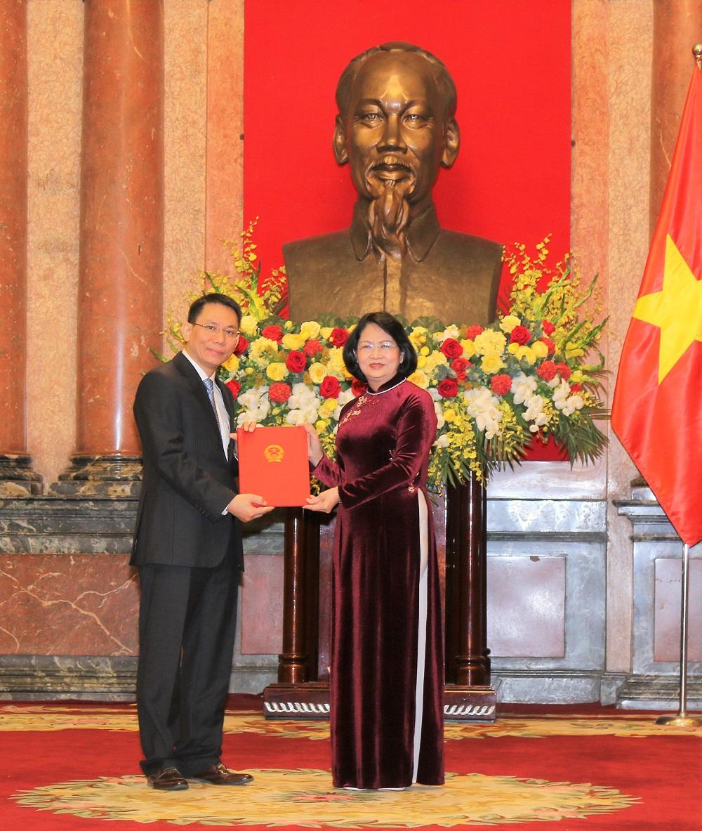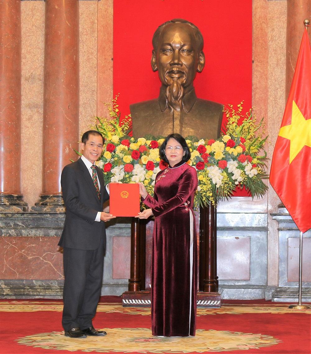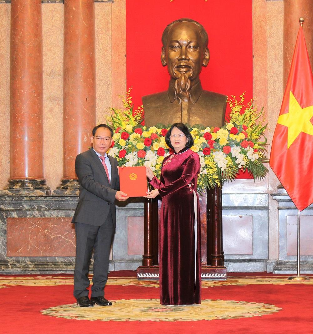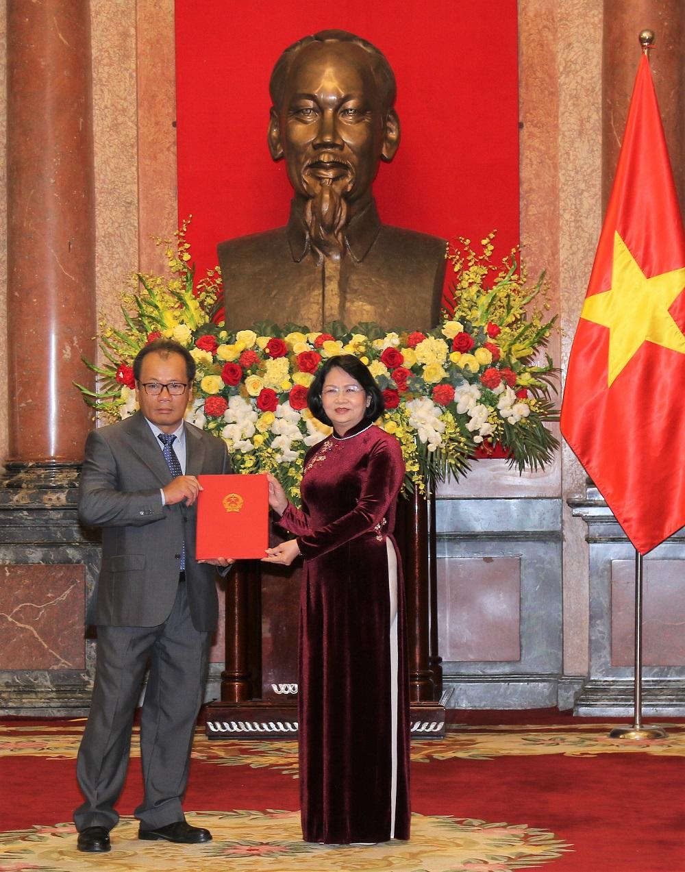 Phó Chủ tịch nước Đặng Thị Ngọc Thịnh trao Quyết định bổ nhiệm ông Trần Văn Khoa làm Đại sứ CHXHCN Việt Nam tại Brunei. (Ảnh: VPCTN/Công Gôn)