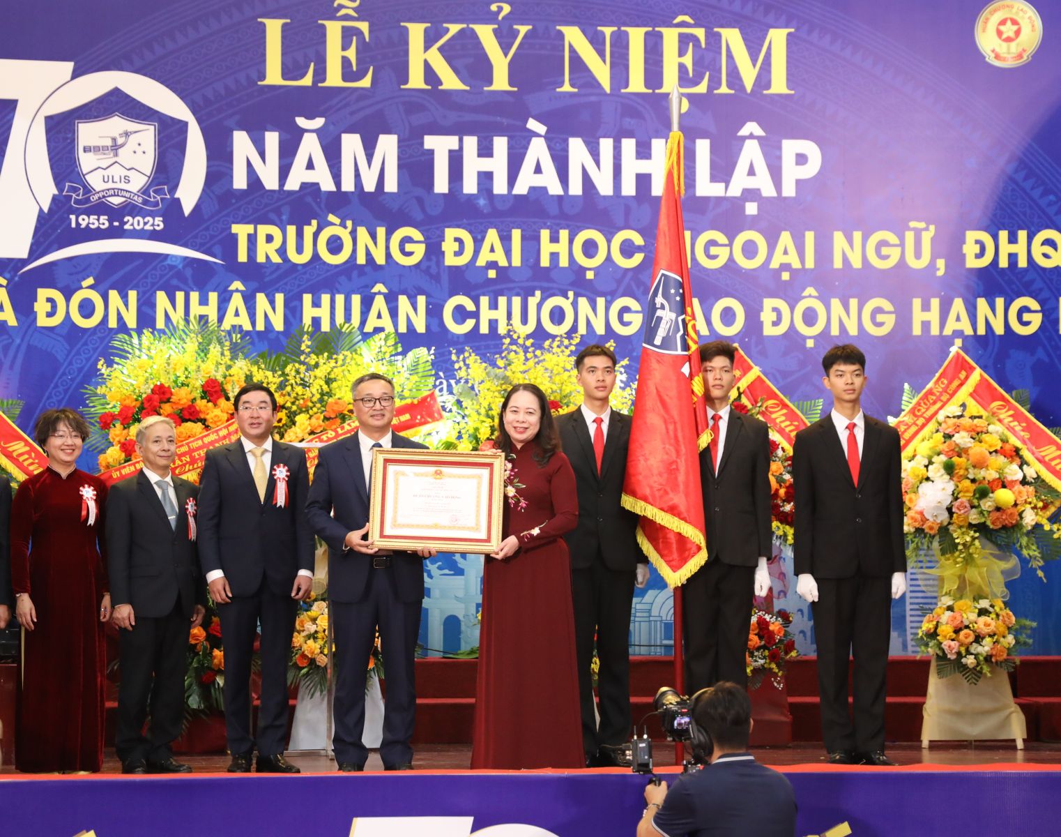 Phó Chủ tịch nước Võ Thị Ánh Xuân trao Huân chương Lao động hạng Nhất cho Trường Đại học Ngoại ngữ - Đại học Quốc gia Hà Nội. Ảnh: VPCTN