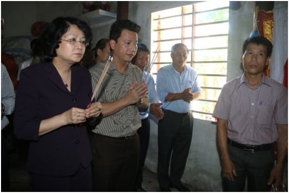 Phó Chủ tịch nước Đặng Thị Ngọc Thịnh thắp hương trước bàn thờ anh Nguyễn Thu Lộc ở xã Sơn Lộc, huyện Can Lộc, tỉnh Hà Tĩnh