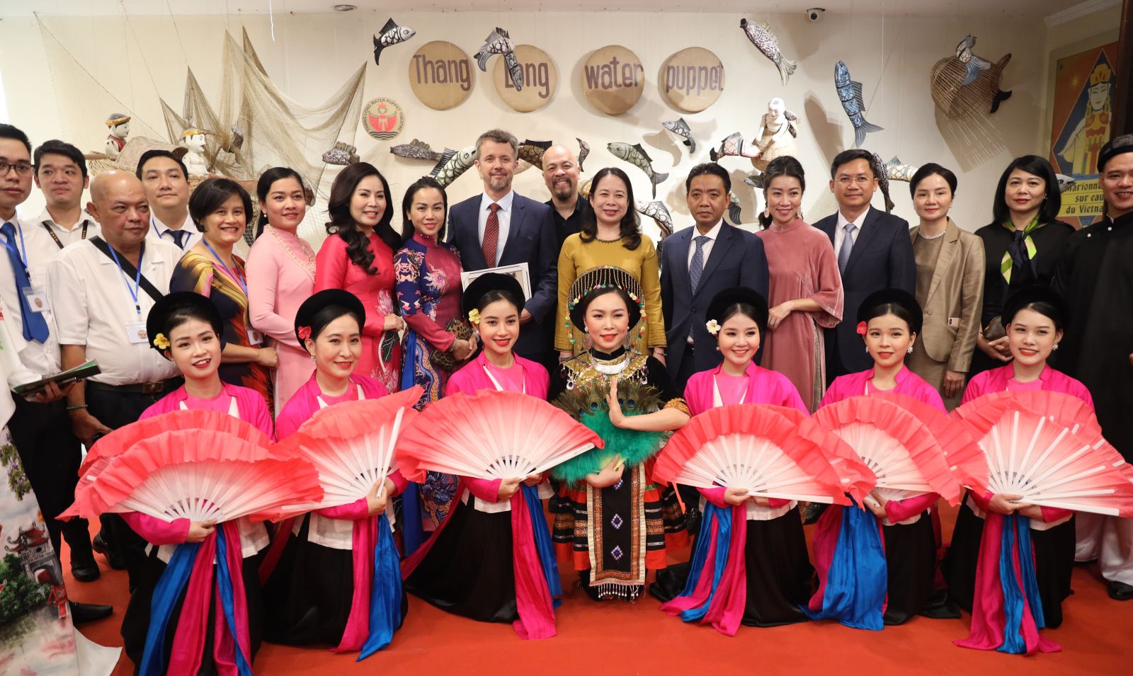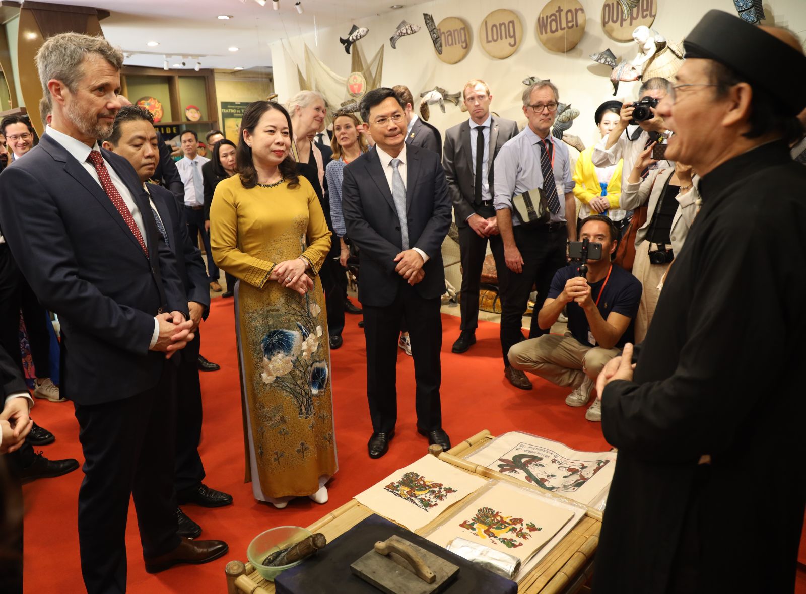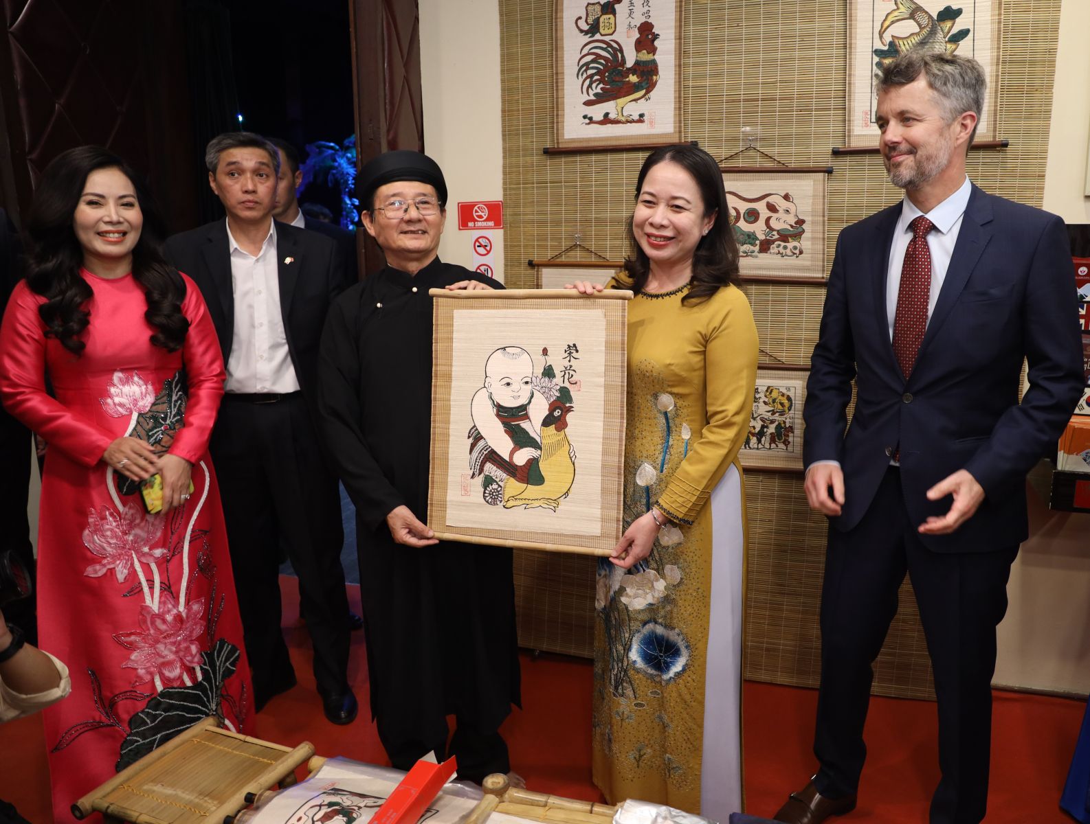 Phó Chủ tịch nước cùng Thái tử kế vị Đan Mạch nghe giới thiệu về tranh Đông Hồ. Ảnh: VPCTN