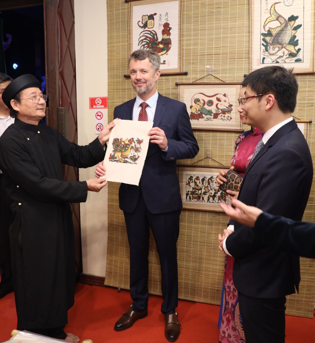Thái tử Phờ-rê-đơ-rích với bức tranh Đông Hồ do ông tự làm. Ảnh: VPCTN