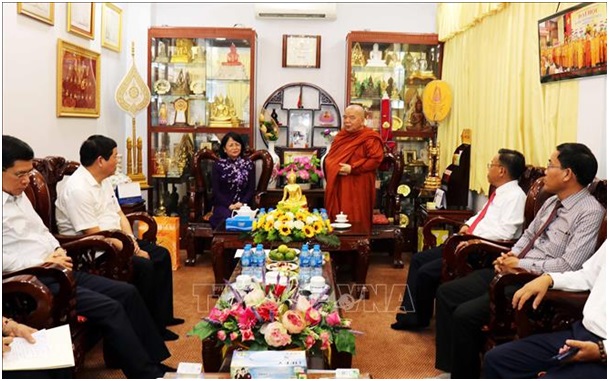 Hòa thượng Thích Thiện Tâm bày tỏ niềm vinh dự được đón Phó Chủ tịch nước và cảm ơn sự quan tâm, tạo điều kiện của lãnh đạo Đảng, Nhà nước đối với sự phát triển của Giáo hội Phật giáo Việt Nam nói chung, Phật giáo Nam tông nói riêng. Trong thời gian qua, với tư cách là thành viên của Mặt trận Tổ quốc Việt Nam, Giáo hội Phật giáo Việt Nam nói chung, Phật giáo Nam tông nói riêng với tinh thần “hộ quốc, an dân” đã làm tốt vai trò, nhiệm vụ của mình trong việc góp phần củng cố, thúc đẩy khối đại đoàn kết toàn dân tộc, đóng góp vào sự nghiệp xây dựng và phát triển đất nước.
