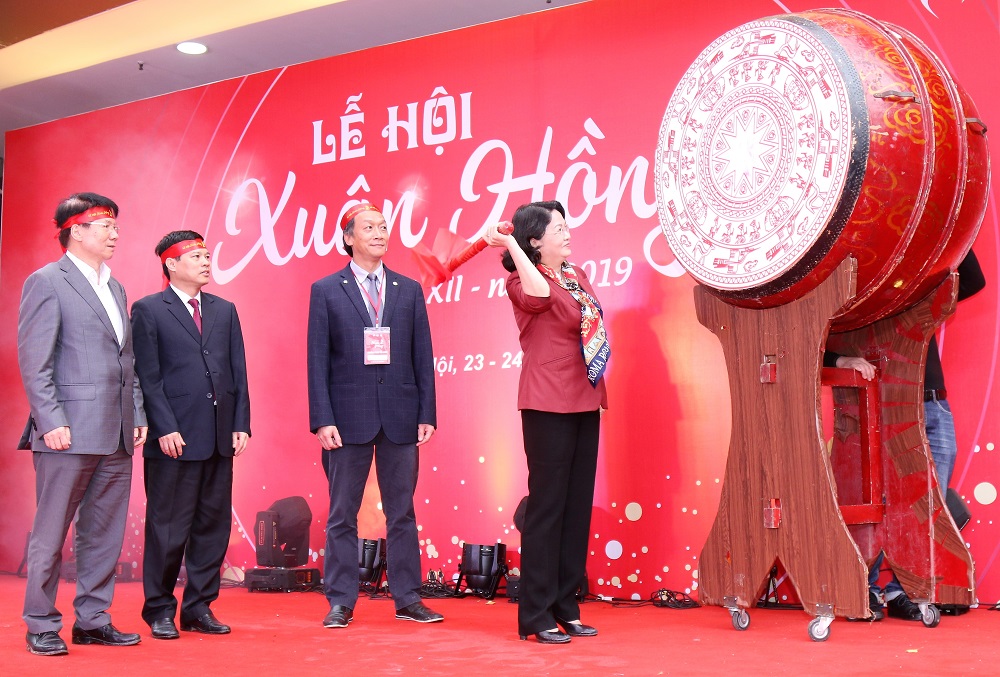 Phó Chủ tịch nước Đặng Thị Ngọc Thịnh đánh trống khai mạc Lễ hội Xuân Hồng 2019. (Ảnh: Công Gôn/VPCTN)